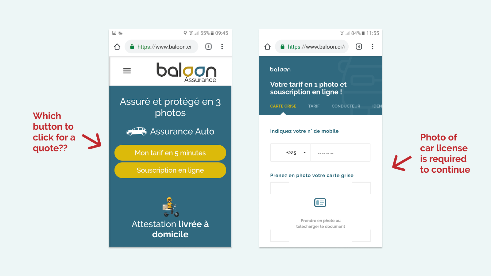 Baloon Assurance, a French startup operating in West Africa, wanted to change this. They used OCR technology to get a quote by uploading a license photo. However, their website wasn’t working – most people left on the first page without getting a quote.