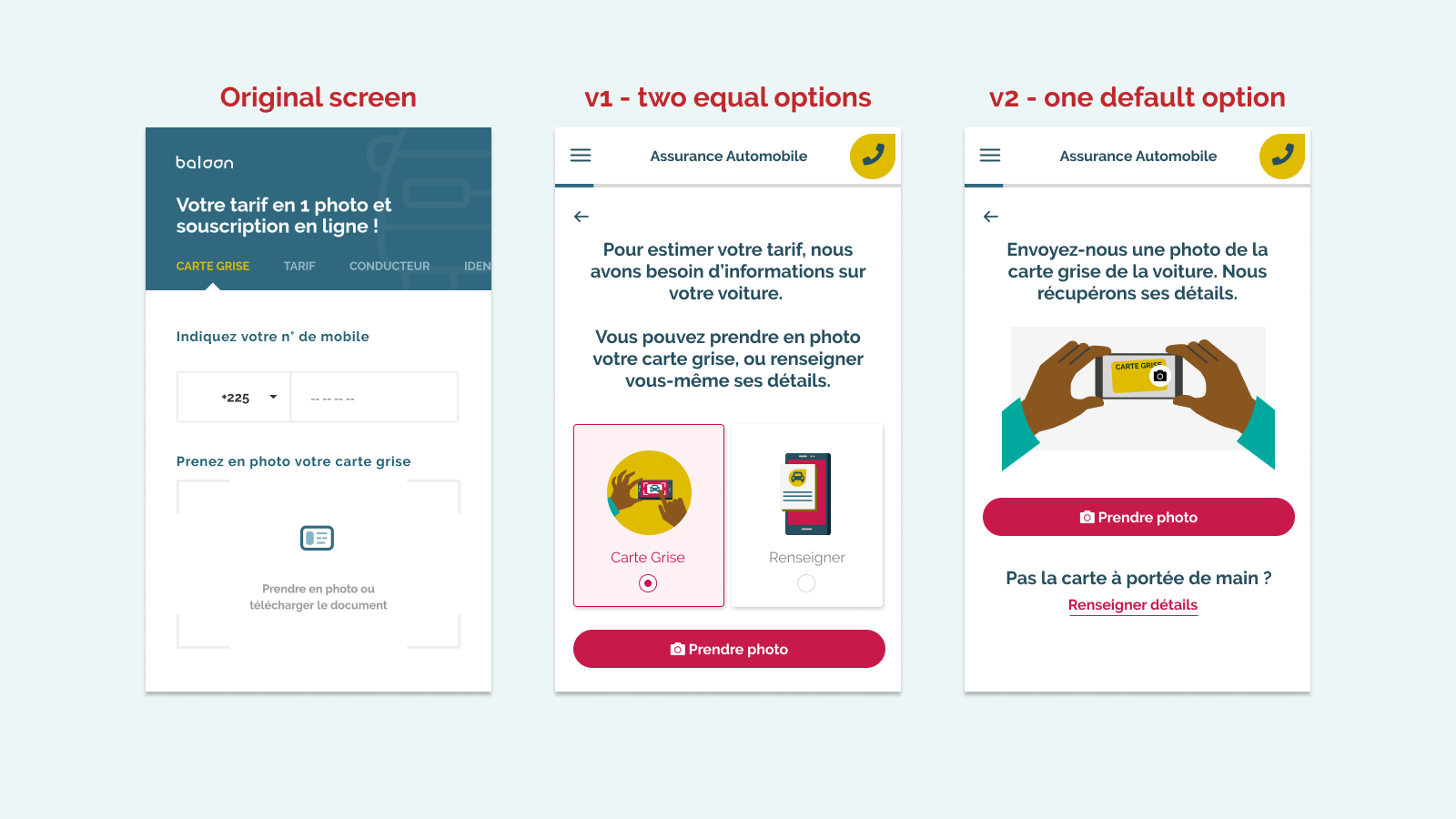 For example, the first screen wasn’t working for two reasons. People were afraid to upload documents, and many didn’t have their licenses handy. So I suggested offering quotes by entering details instead of uploading. But when we tested this option, it confused people!